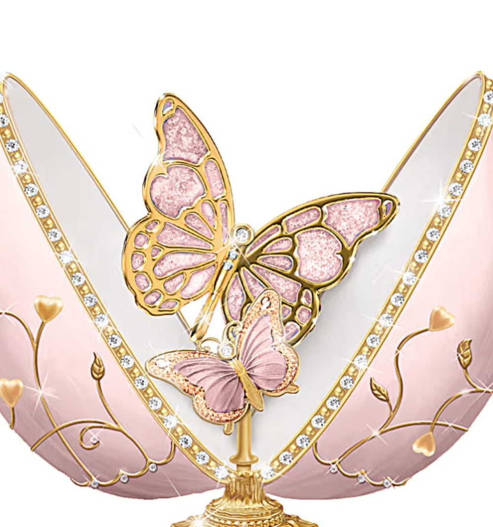 • Inside the egg, a pair of magnificent hand-enameled butterflies symbolize a grandmother and granddaughter
