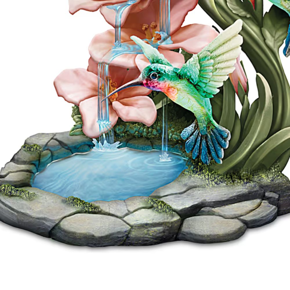Expertly handcrafted in artist's resin, each intricate treasure is sure to be at home among your garden decor collection. Painted by hand, they bring to life the wonder of jewel-toned visitors hovering amongst lifelike natural settings filled with blossoms, moss-touched rocks and more. In Issue One, the clear, trickling water is captured in crystalline and brilliantly illuminated by hidden LEDs to add to the amazing effect. From every angle, each impressively sized sculpture brings you a rare and thrilling view of nature.