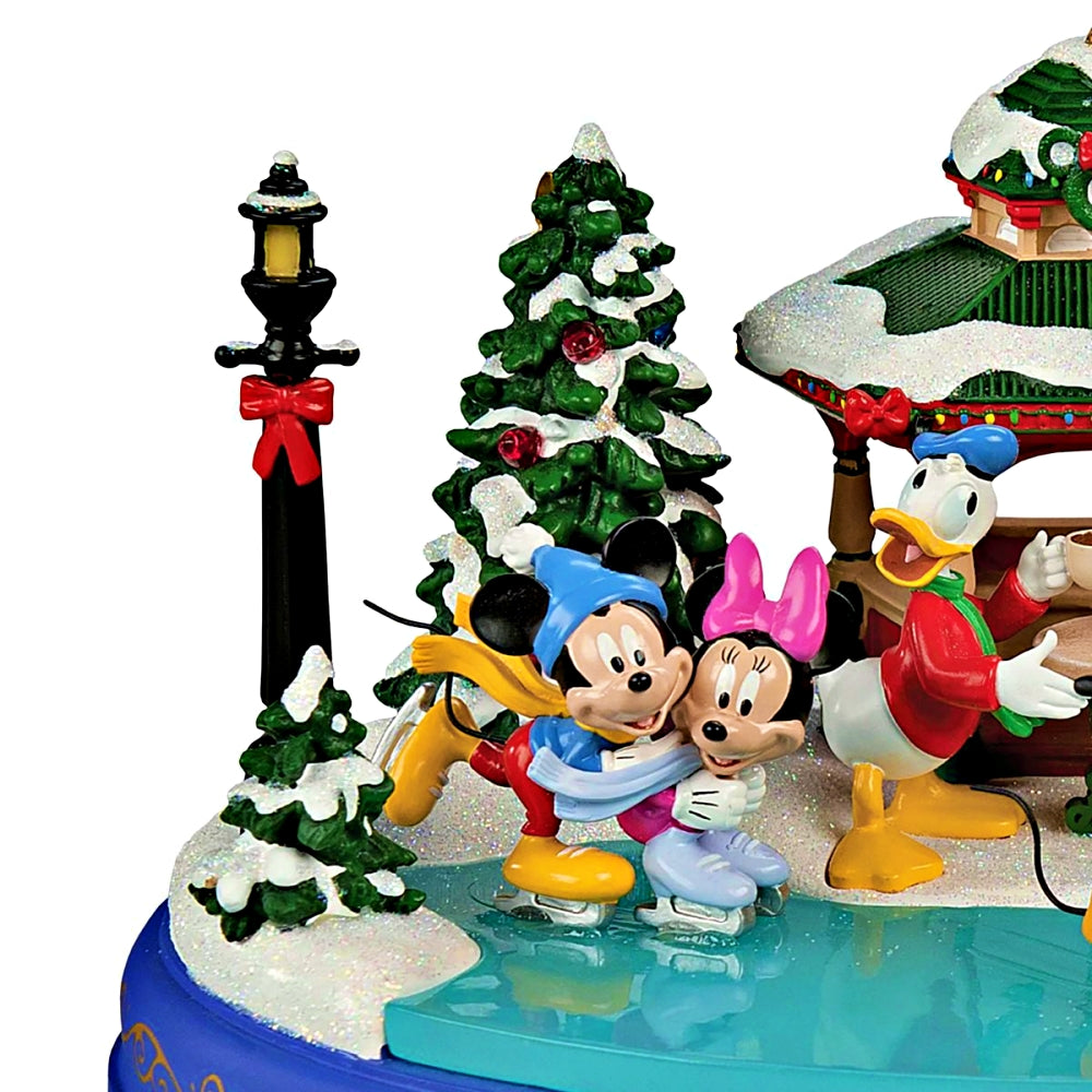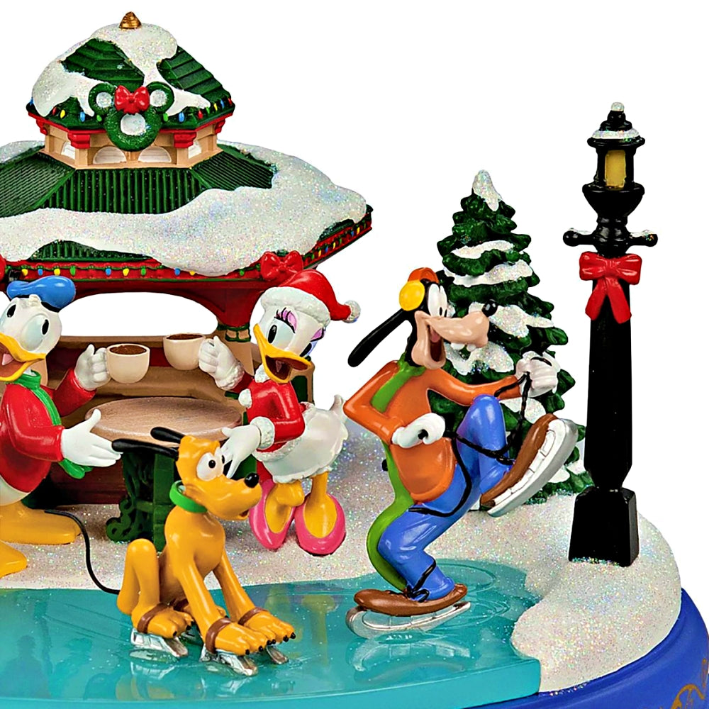 Expertly handcrafted of artist's resin and hand-painted, this illuminated, musical Disney collectible captures beloved Disney characters in fully sculpted form, including Disney's Mickey Mouse and Minnie Mouse figure skating, Disney's Donald Duck and Daisy Duck enjoying a cup of hot cocoa, Disney's Pluto careening toward a snowbank and Disney's Goofy lacing up his skates to join the fun. Nearby, a freshly decorated tree and two old-fashioned lampposts shine with built-in LEDs. LED lights concealed within the icy crystalline skating pond illuminate with a soft blue glow. Plus, push a button and you'll hear a medley of 8 favorite holiday carols for the perfect finishing touch.
