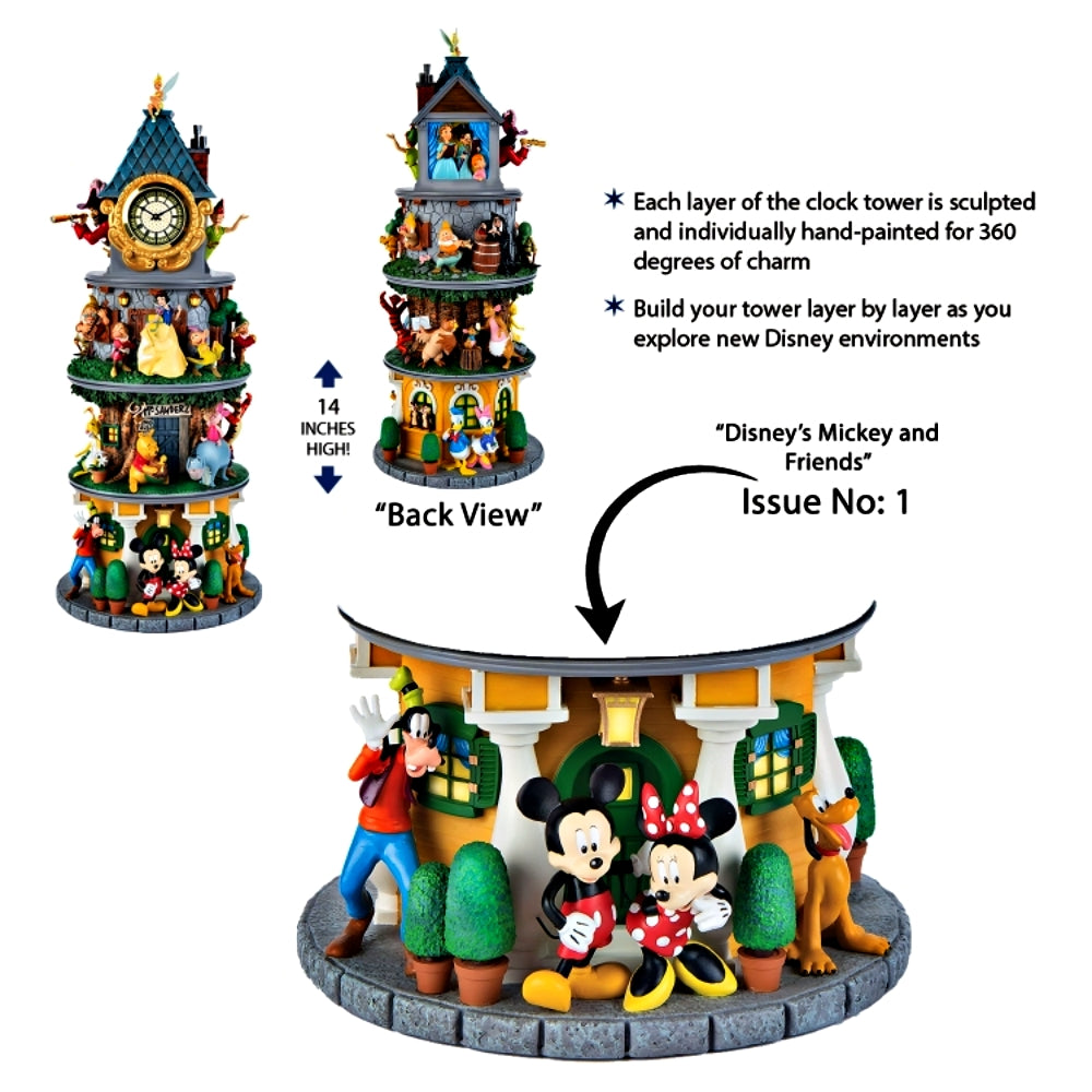 • Issues One through Four complete your first Disney collectible clock tower, boasting a total of 31 beloved characters in unique environments, from Disney's Mickey Mouse and his best pals to Disney's Winnie the Pooh and the Hundred Acre Wood and the fairytale forest with Disney's Snow White