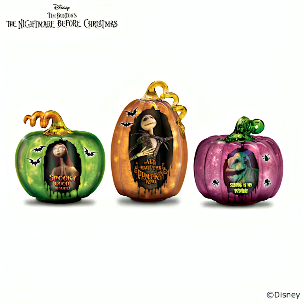 Disney Tim Burton's "The Nightmare Before Christmas" remains one of the most enduring and influential animated films ever made and is a favorite of countless fans and collectors. Now, this collection of glowing The Nightmare Before Christmas glass pumpkins celebrates the beloved film and its memorable characters. Introducing the Spooky Charms Pumpkin Sculpture Collection, available from The Bradford Exchange. Licensed from Disney, this collection begins with Issue One, Spooky Good Mischief. Next to arrive will be Issue Two, All Hail the Pumpkin King, and soon your collection will continue with Issue Three, Scaring is My Business and additional collectible The Nightmare Before Christmas pumpkin sculptures, each a separate issue to follow.‡