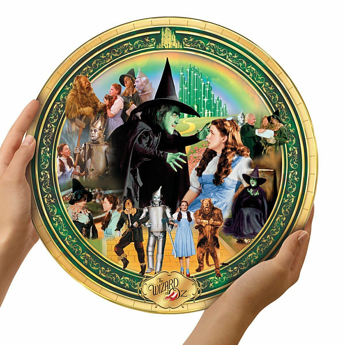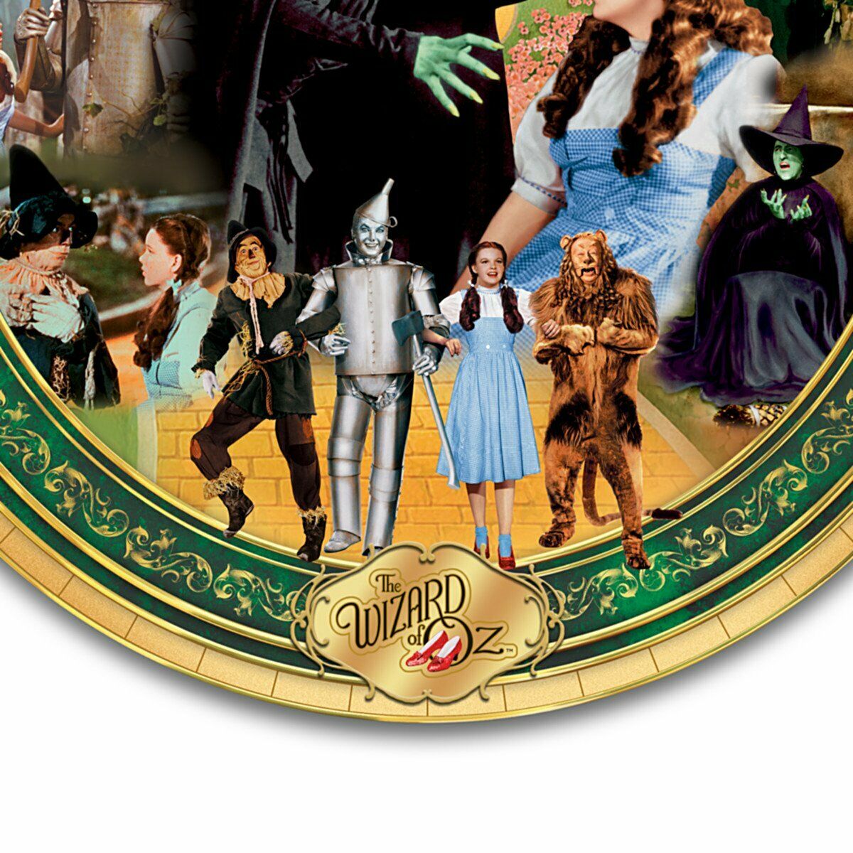 Featuring a fascinating montage of eight scenes from the movie, this WIZARD OF OZ collectible plate highlights unforgettable moments with beloved characters like DOROTHY™ SCARECROW™, TIN MAN™, the COWARDLY LION™ and more! The central image of this plate features DOROTHY™ and the WICKED WITCH OF THE WEST™, surrounded by images of the friends who journeyed with her down the YELLOW BRICK ROAD™. THE EMERALD CITY™, the land beyond the rainbow, is featured as well. Other lavish details include a brilliant YELLOW BRICK ROAD outer border embellished with 22K gold, four 22K gold rims, an emerald-green inner border with 22K gold filigree that includes an image of EMERALD CITY at the top, and an impressive 22K gold title plaque with THE WIZARD OF OZ logo. This collectible plate arrives in a Deluxe Presentation Case with silken lining.