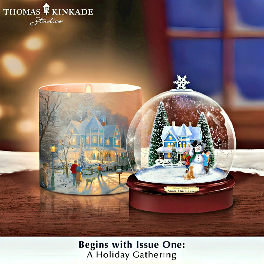 • The sights, scents and sounds of the holiday season come to life in this Thomas Kinkade Studios Scent-sational Holiday Treasures Snowglobe Candle Collection, a first-ever available exclusively from The Bradford Exchange
