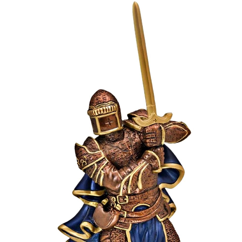 • Handcrafted in cold-cast bronze and hand-painted with golden highlights, each sculpture in this collection captures a powerful knight and makes a stunning religious collectible