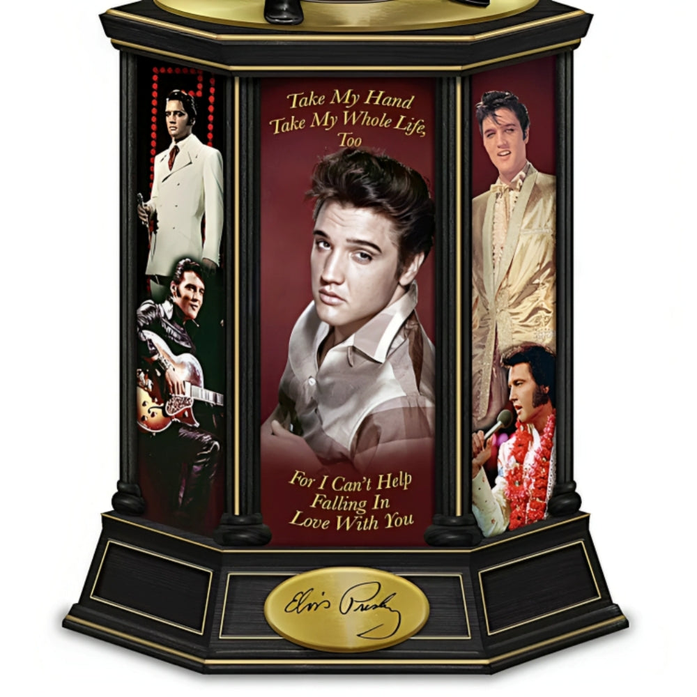 And as a special tribute to his greatest love song that held the #1 spot in the charts for an incredible 20 weeks in 1957, the front panel features the lyrics "Take My Hand Take My Whole Life, Too", "For I Can't Help Falling In Love With You". Below the lyrics is his replica signature on a bronze-like metallic plaque. What's more, with just the touch of a button, each panel lights up from within, accentuating every remarkable detail! To complete this striking tribute, a meticulously handcrafted and hand-painted sculptural likeness of Elvis, dressed in his famous black leather jacket and playing his guitar, sits atop the tower. This amazing tribute is the perfect addition to your Elvis decor. Measure 10" H; 25.4 cm H Requires 3 "AAA" batteries (not included) ELVIS™ and ELVIS PRESLEY™ are trademarks of ABG EPE IP LLC. Rights of Publicity and Persona Rights: Elvis Presley Enterprises, LLC ©2020 ABG EPE IP LLC. elvis.com ©2020 The Hamilton Collection. All Rights Reserved.